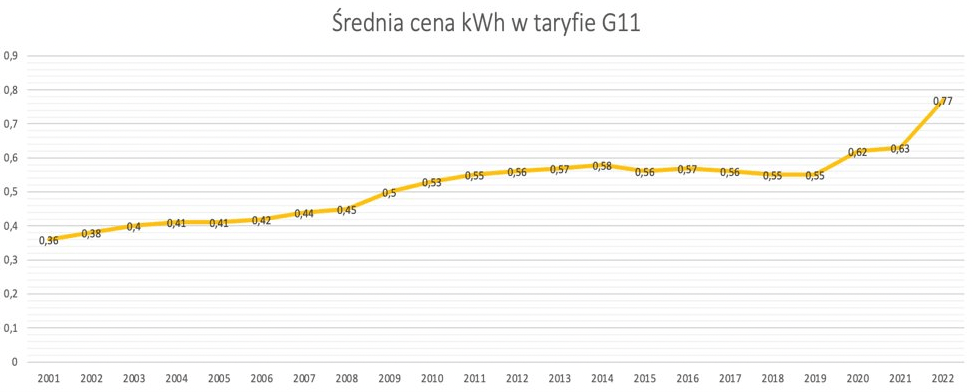 Od stycznia 2022 r. cena prądu wzrosła z ok. 73 do 77 gr/kWh, a od kwietnia 2022 – gdy skończyła się obniżka VAT – do 90 gr/kWh. Obserwując rynek i monitorując ceny na giełdzie szacuje się, że cena 1 kWh przekroczy 1 zł w ciągu najbliższych 2 lat.